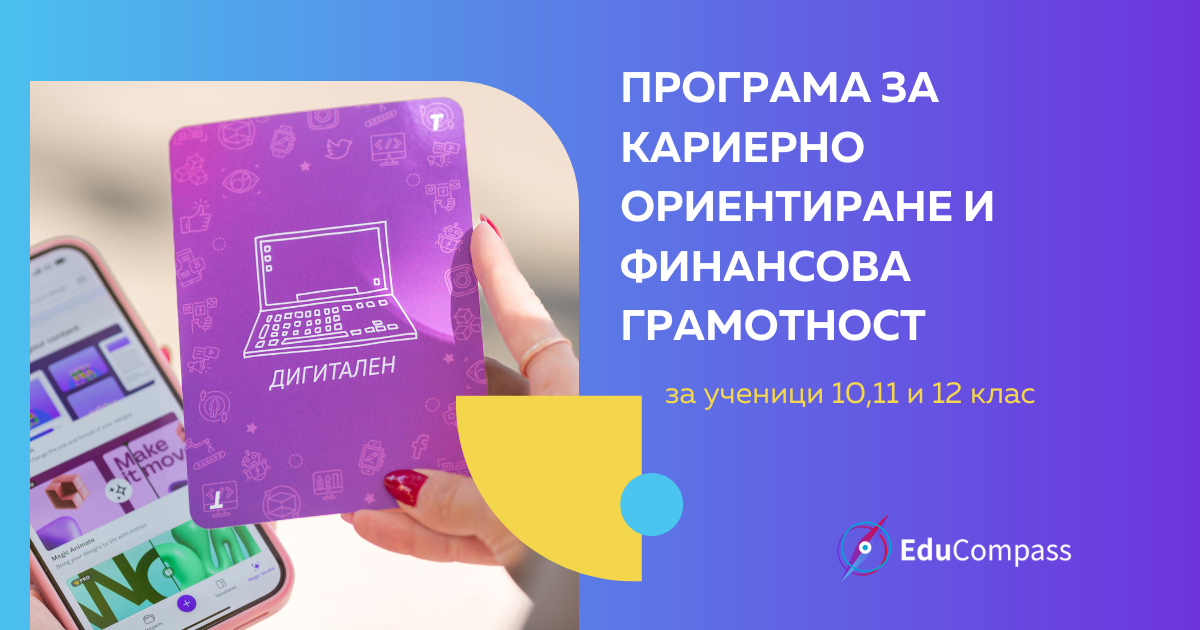 Каним ви да се включите в безплатна програма за кариерно ориентиране и финансова грамотност за ученици 10 -12 клас, която се провежда под формата на 3 работилници на живо и предизвикателства за учениците за самостоятелна работа.